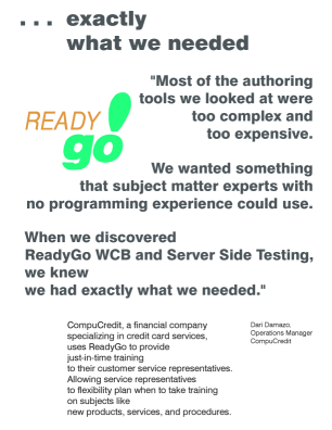 "ReadyGo WCB and Server-Side Testing are proving to be valuable tools, and are transforming CompuCredit's training process."
