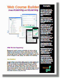 ReadyGo WCB e-Learning and m-Learning software features a highly intuitive user interface, fast course generation, powerful template creation/usage, and automatic generation of navigation elements including chapter and course indices.